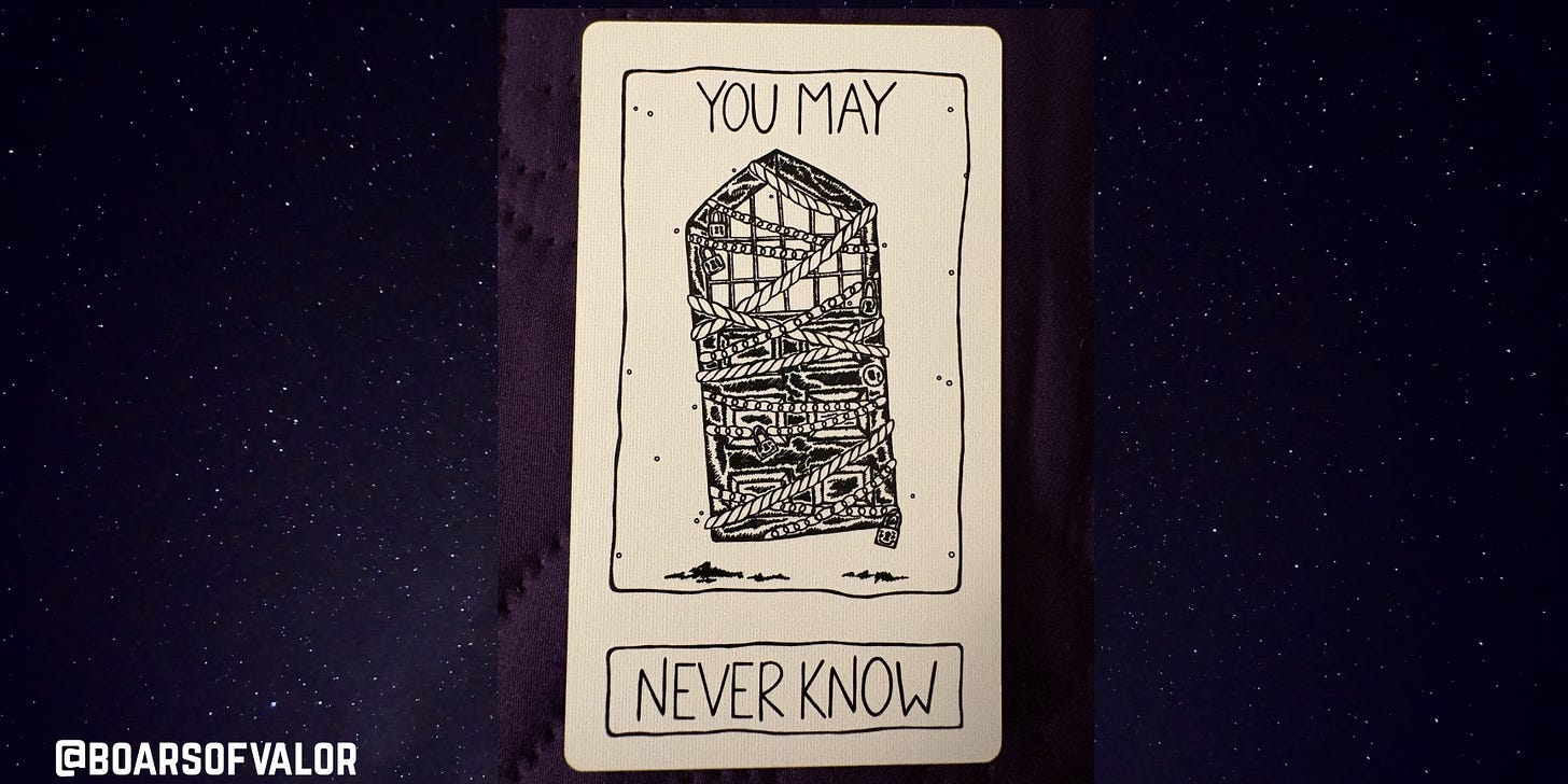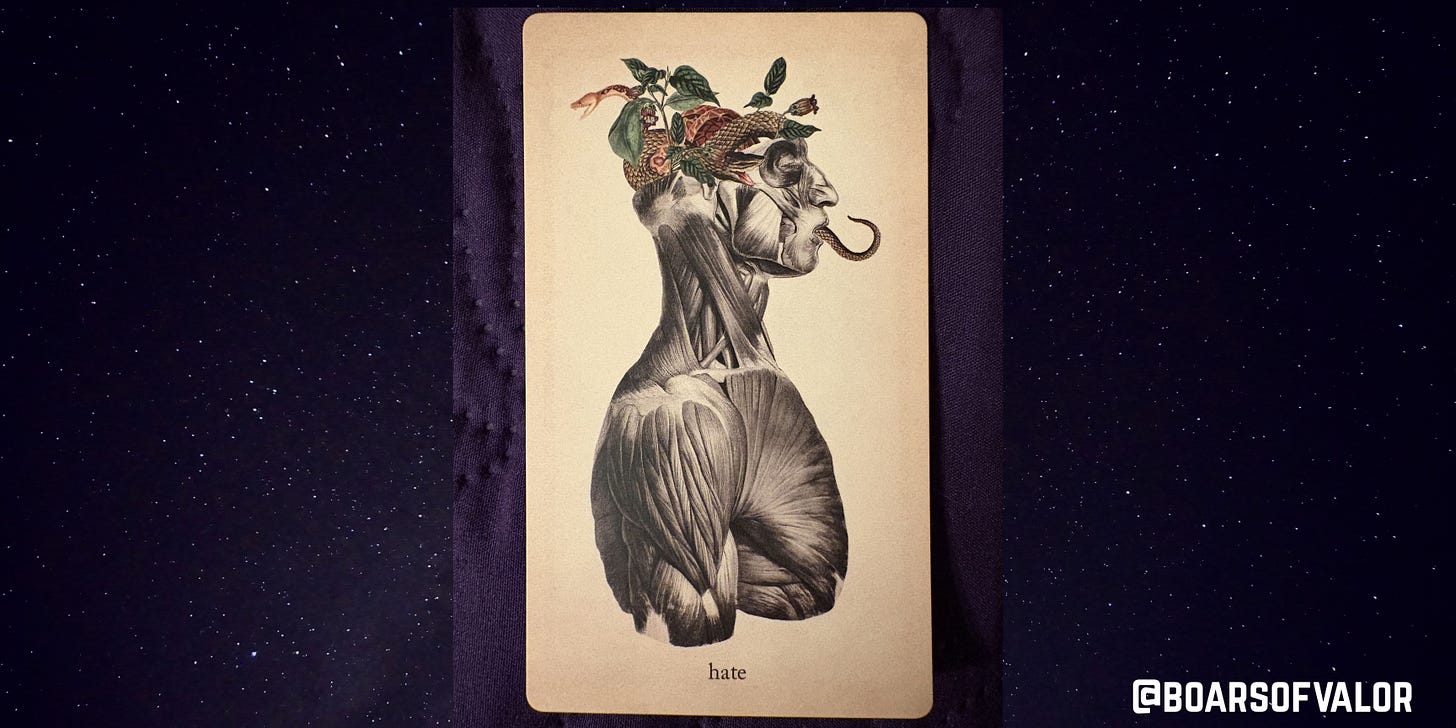 This is the first time I have ever used this deck. And I was absolutely startled by this card. Almost speechlessly so. (Is there a writer version of speechless?). Because yeah, there is so much hate right now it can be suffocating. So, I zoomed into the image (I moved the card toward my face). I expected the brain to have some sort of rot in the plants. (I have low lighting where I am doing this.) No. It is snakes among leaves. Are those leaves poisonous? Possibly, hate can seep into a soul like a poison and corrupt one’s soul, one’s essence, one’s worldview. However, I would like to focus on the SNAKES. What do snakes do? SHED THEIR SKIN. What should you do at full moons? RELEASE. What negativity are you holding onto that it is time to release? Do not let it poison you. It could be something you do not label as hate, but it is heavy on your heart. It is holding you back and you need to free yourself from this burden.