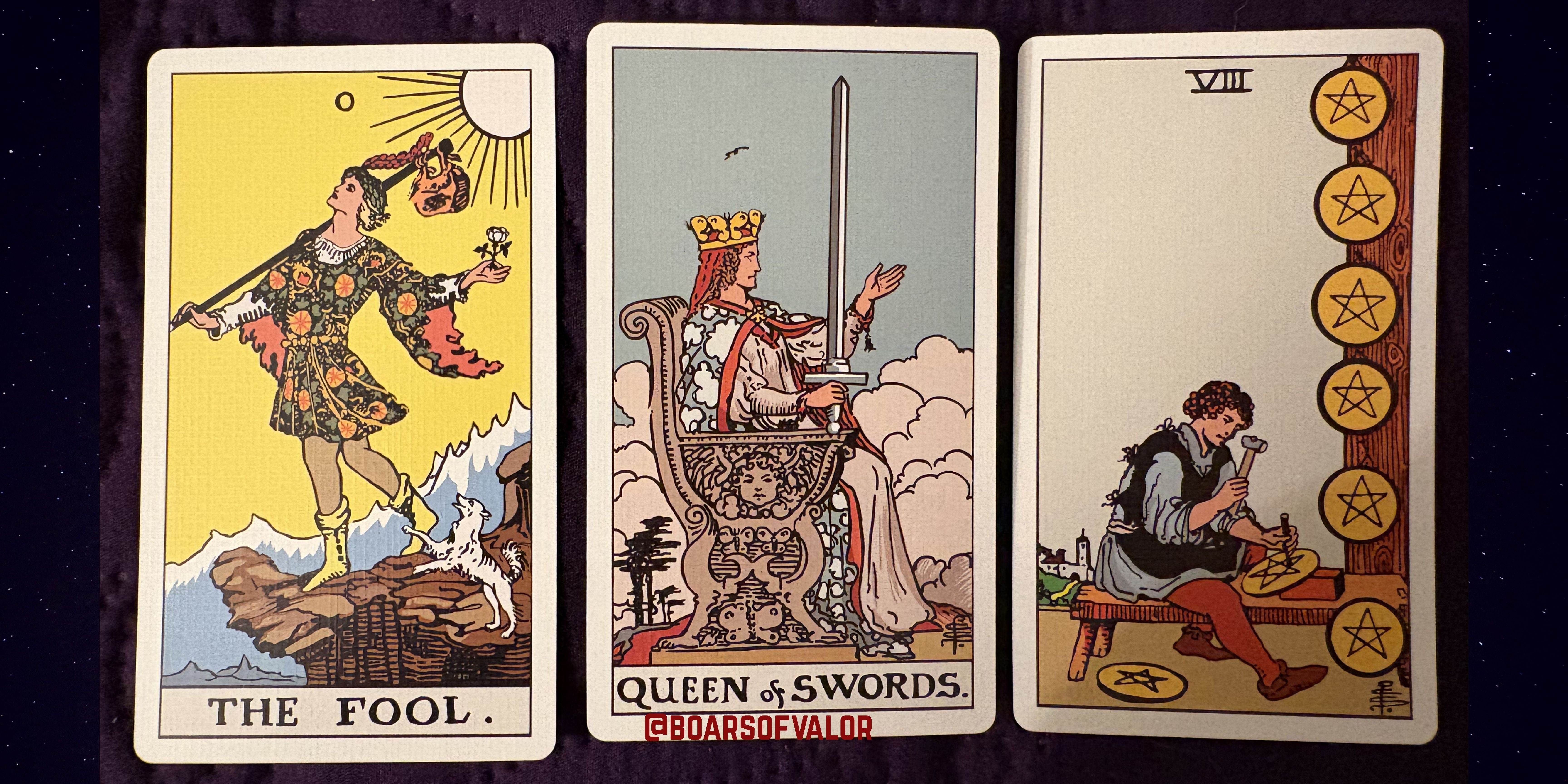 The Fool, Queen of Swords, 8 of Pentacles